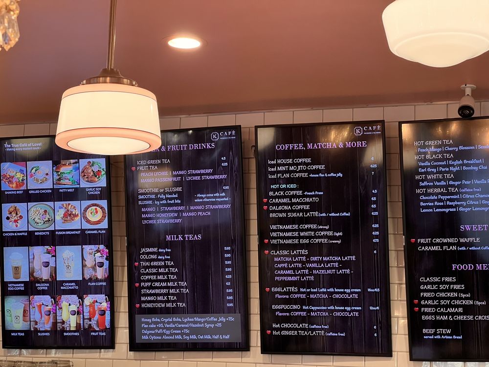 Introducing K Cafe Patisserie & Tea House, a delightful spot for desserts, coffee, and brunch in San Jose, California. This Asian and women-owned establishment offers a classy ambiance with free Wi-Fi, outdoor seating, and a variety of options for breakfast and dinner. Customers rave about the beautiful decor, making it an ideal spot for celebrations or casual outings. The menu features delicious offerings like Shrimp Toast, Lemongrass Chicken, and Classic French Fries. Guests appreciate the aesthetically pleasing presentation of dishes, creating a memorable dining experience. While some find the pricing a bit high, the quick service and kind staff add to the overall enjoyment. If you're looking for a picturesque setting with quality food, K Cafe Patisserie & Tea House is worth a visit.